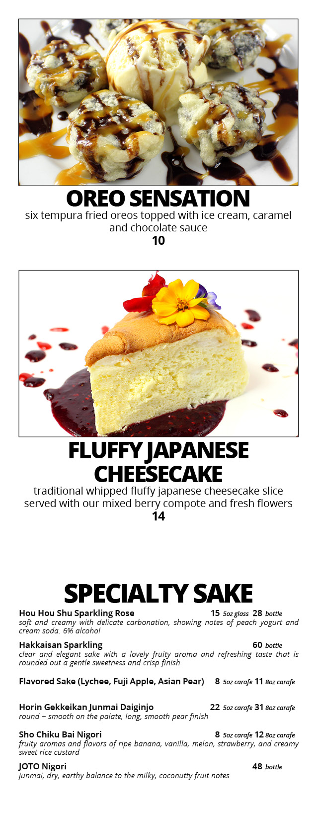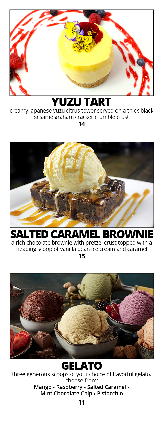 From light, Japanese-inspired confections to rich, decadent classics with a modern twist, every plate is made from scratch using premium ingredients. Our new dessert menu is the ultimate way to round out your dining experience.