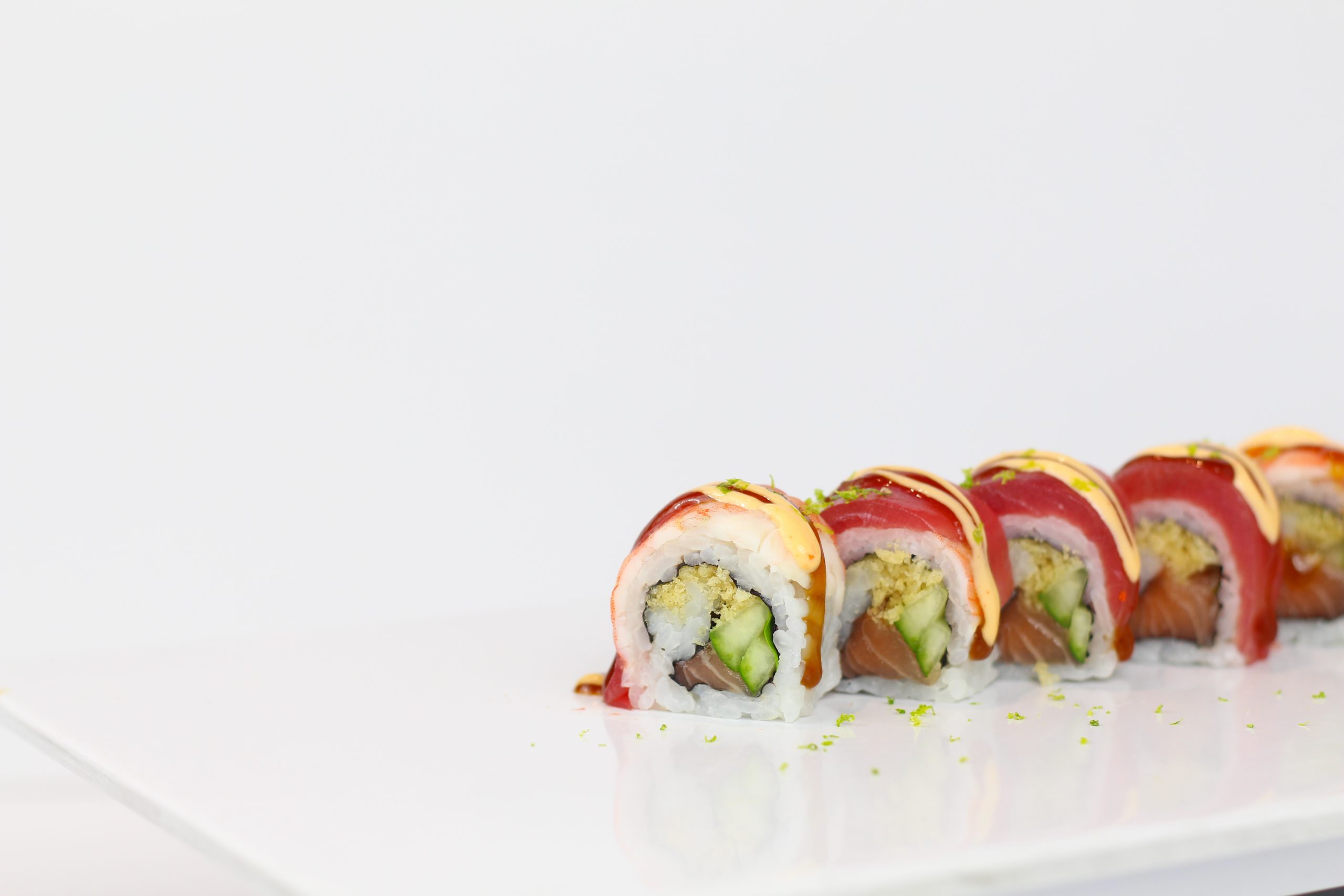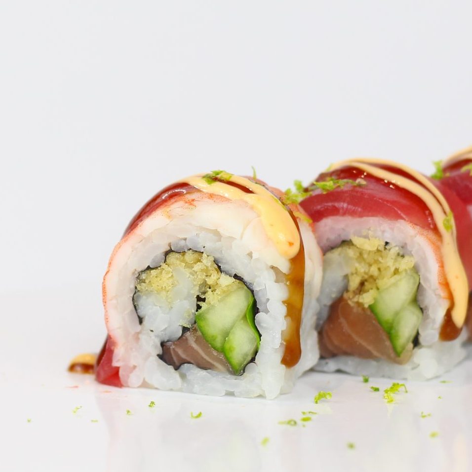 spicy crunchy salmon and cucumber roll topped with tuna, steamed shrimp, spicy mayo, eel sauce and lime zest