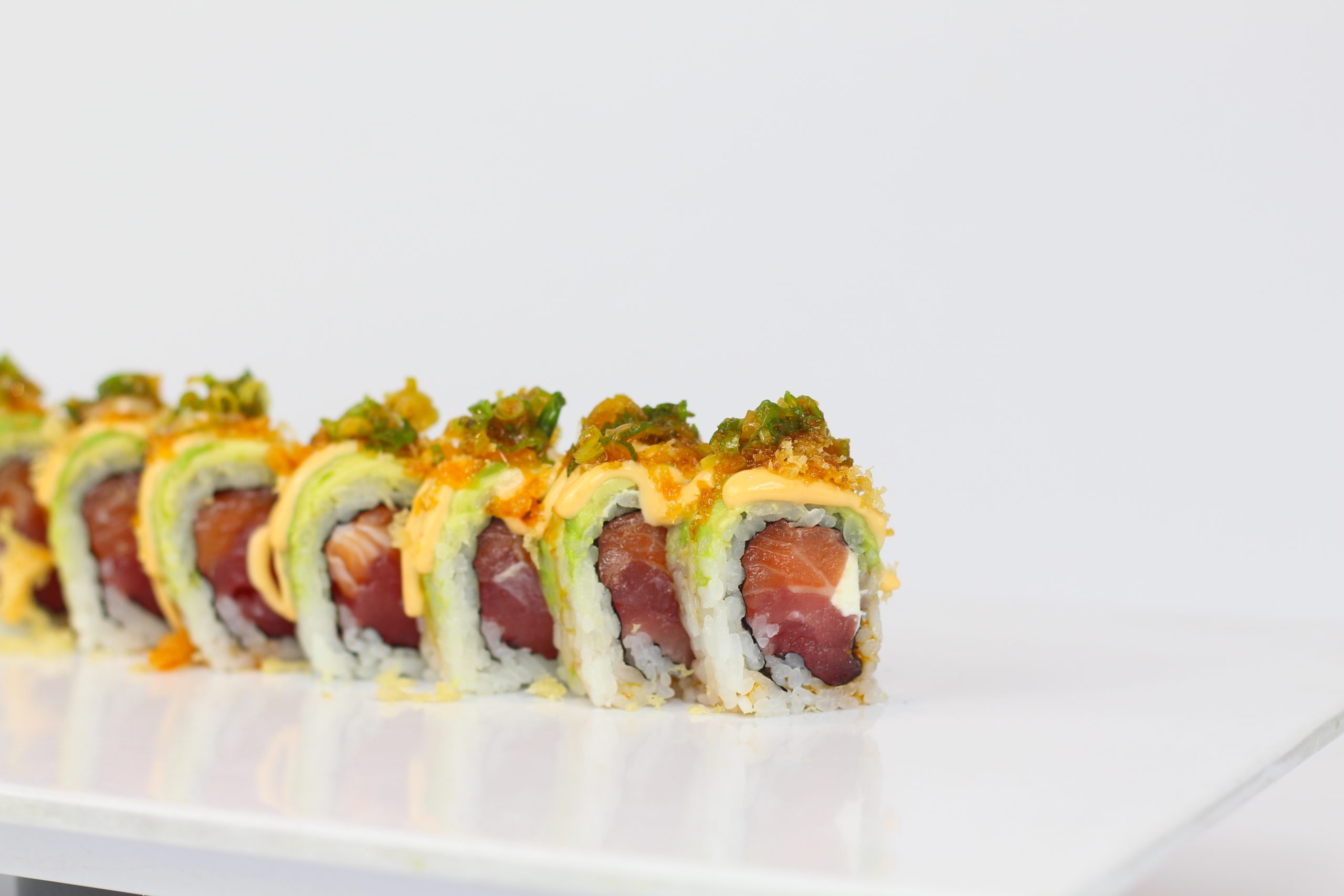tuna, salmon and cream cheese topped with avocado, spicy mayo, spicy sesame oil, roe and tempura chips
