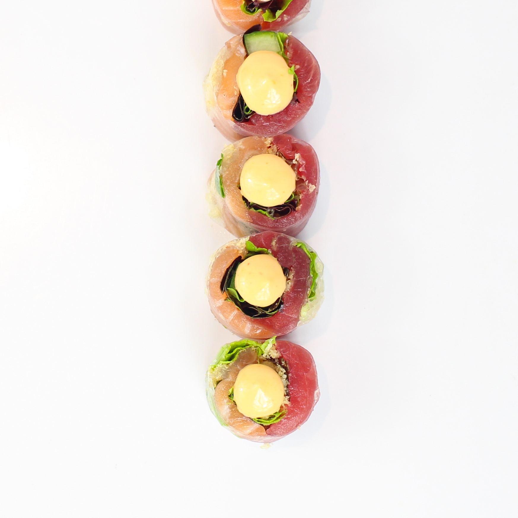 tuna, salmon, tempura chips, cucumber, mixed greens rice paper wrap, spicy mayo, ponzu sauce