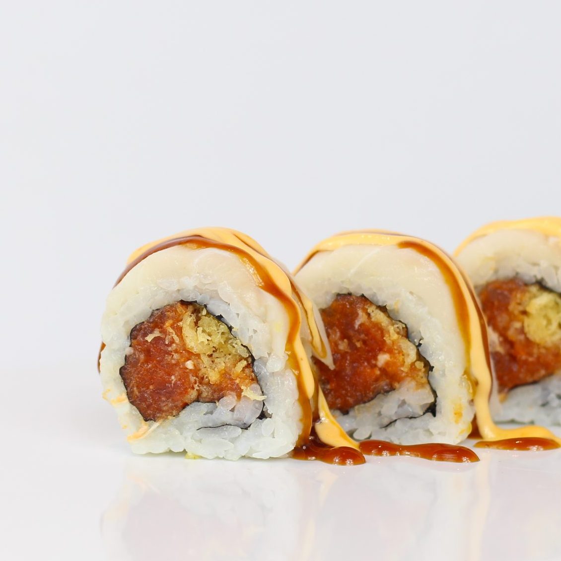spicy crunchy tuna roll topped with escolar, spicy mayo and eel sauce