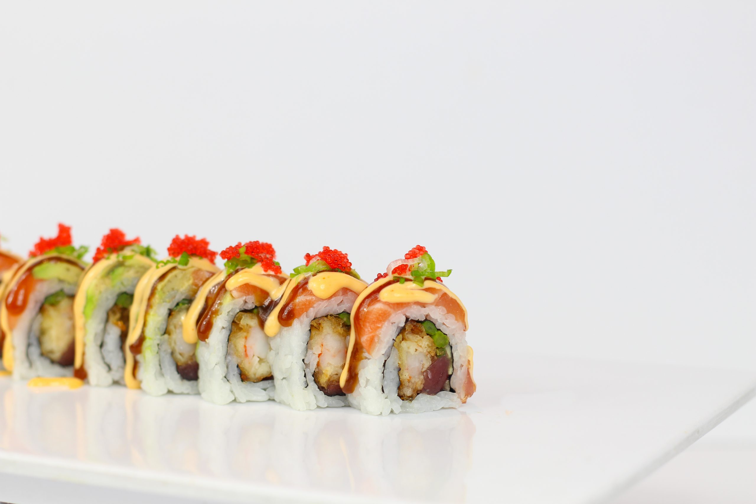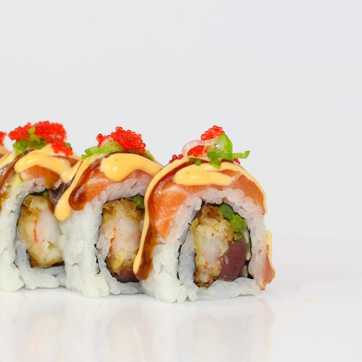 marinated tuna, fried shrimp, asparagus, cucumber with salmon, avocado, spicy mayo, eel sauce, wasabi mayo, scallion and tobiko