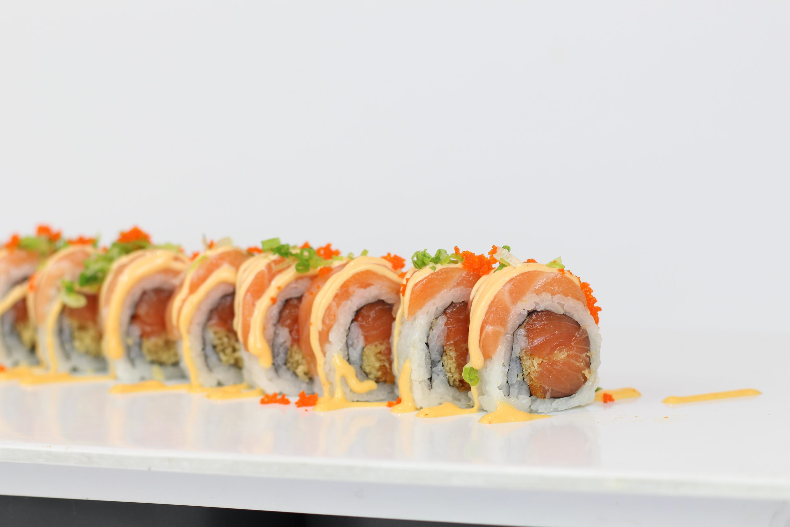 spicy crunchy salmon roll topped with salmon, spicy mayo, scallion and roe