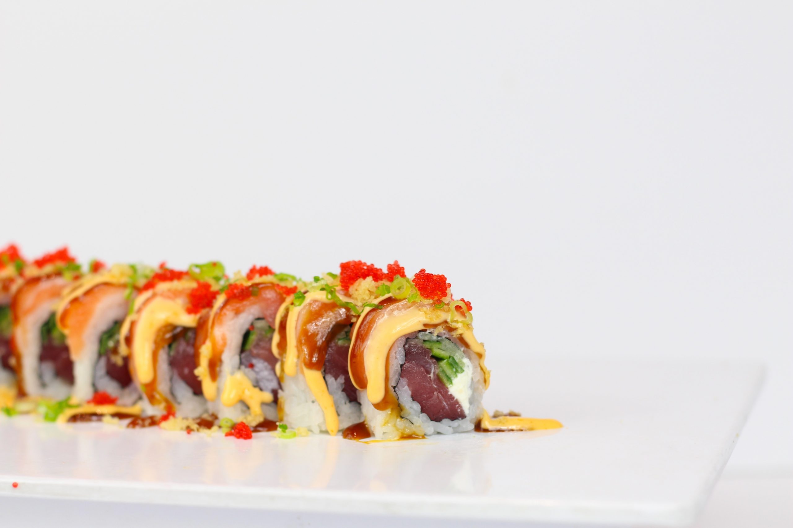 tuna, cream cheese, cucumber with salmon, eel sauce, spicy mayo, scallions, tempura chips and tobiko