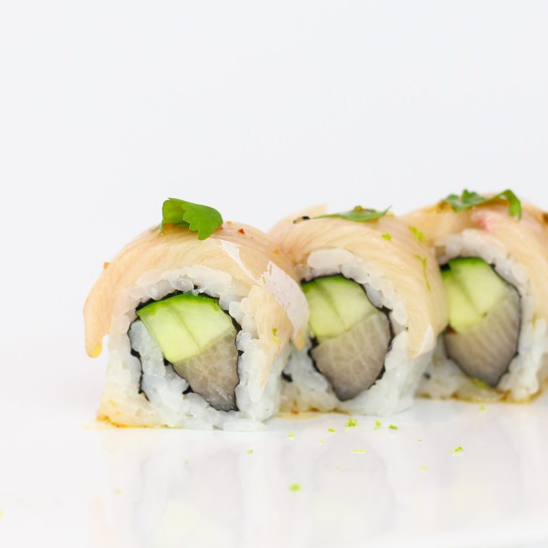 yellowtail and cucumber roll topped with yellowtail, cilantro, lime zest and awesome sauce